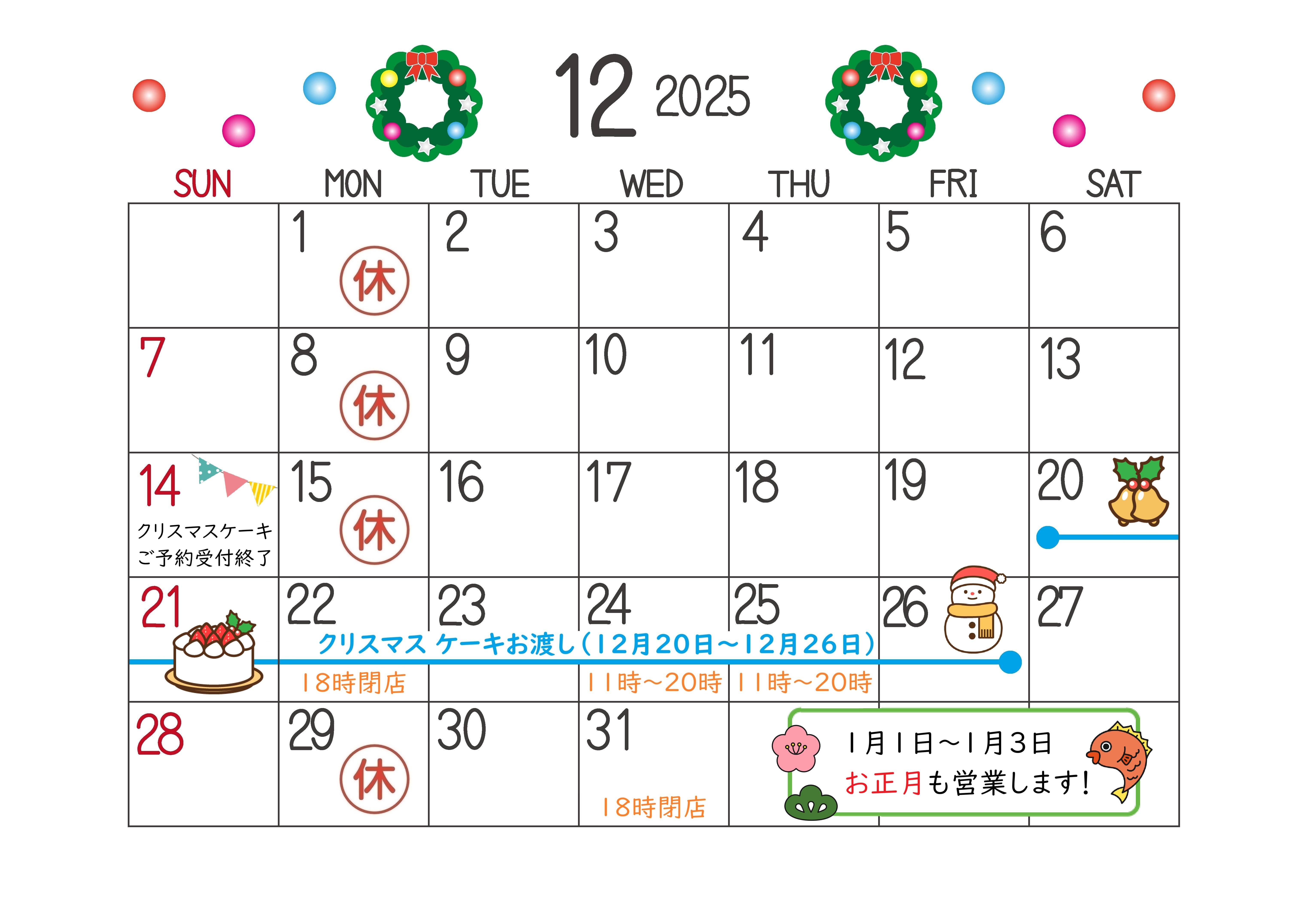 クリスマス期間中のためデコレーションケーキのご予約・販売はクリスマスケーキ全品ホワイトデコレーションチョコデコレーションのみとさせていただきます。(数量限定商品は完売次第終了)あらかじめご了承ください。